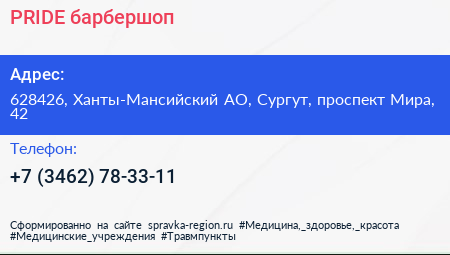PRIDE, барбершоп по адресу 628426, Ханты-Мансийский АО, Сургут, проспект Мира, 42 в дальнейшем Организация, размещена в следующих категориях: