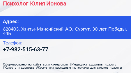 Психолог Юлия Ионова по адресу 628403, Ханты-Мансийский АО, Сургут, 30 лет Победы, 44Б в дальнейшем Организация, размещена в следующих категориях: