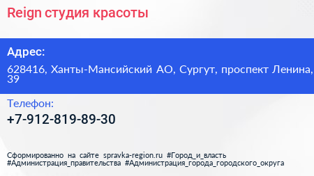 Reign, студия красоты по адресу 628416, Ханты-Мансийский АО, Сургут, проспект Ленина, 39 в дальнейшем Организация, размещена в следующих категориях: