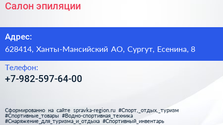 Салон эпиляции по адресу 628414, Ханты-Мансийский АО, Сургут, Есенина, 8 в дальнейшем Организация, размещена в следующих категориях: