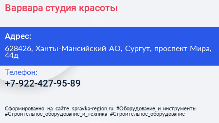 Варвара, студия красоты по адресу 628426, Ханты-Мансийский АО, Сургут, проспект Мира, 44д в дальнейшем Организация, размещена в следующих категориях: