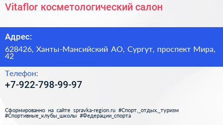 Vitaflor, косметологический салон по адресу 628426, Ханты-Мансийский АО, Сургут, проспект Мира, 42 в дальнейшем Организация, размещена в следующих категориях: