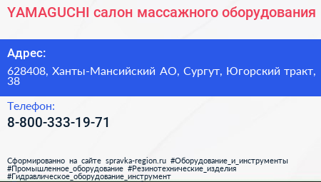 YAMAGUCHI, салон массажного оборудования по адресу 628408, Ханты-Мансийский АО, Сургут, Югорский тракт, 38 в дальнейшем Организация, размещена в следующих категориях: