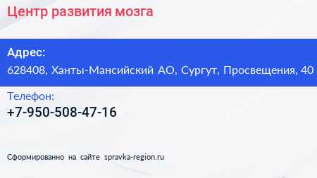 Центр развития мозга по адресу 628408, Ханты-Мансийский АО, Сургут, Просвещения, 40 в дальнейшем Организация, размещена в следующих категориях: