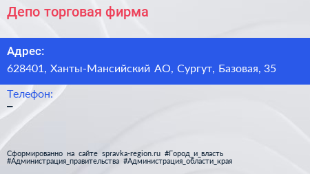 Депо, торговая фирма по адресу 628401, Ханты-Мансийский АО, Сургут, Базовая, 35 в дальнейшем Организация, размещена в следующих категориях: