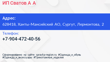 ИП Сватов А.А. по адресу 628418, Ханты-Мансийский АО, Сургут, Лермонтова, 2 в дальнейшем Организация, размещена в следующих категориях: