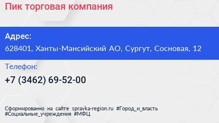 Пик, торговая компания по адресу 628401, Ханты-Мансийский АО, Сургут, Сосновая, 12 в дальнейшем Организация, размещена в следующих категориях: