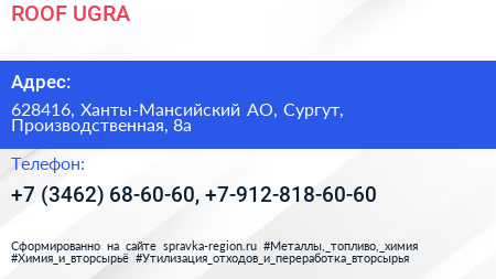 ROOF UGRA по адресу 628416, Ханты-Мансийский АО, Сургут, Производственная, 8а в дальнейшем Организация, размещена в следующих категориях: