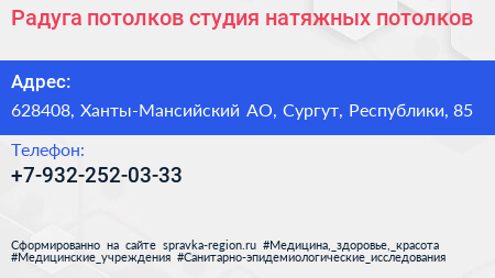 Радуга потолков, студия натяжных потолков по адресу 628408, Ханты-Мансийский АО, Сургут, Республики, 85 в дальнейшем Организация, размещена в следующих категориях: