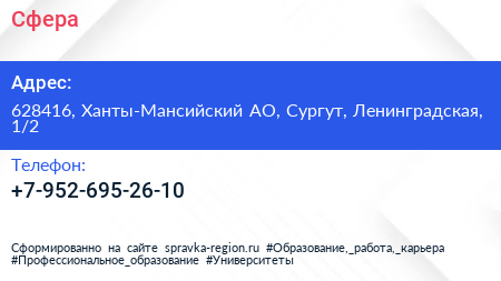 Сфера по адресу 628416, Ханты-Мансийский АО, Сургут, Ленинградская, 1/2 в дальнейшем Организация, размещена в следующих категориях:
