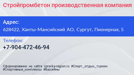 Стройпромбетон, производственная компания по адресу 628422, Ханты-Мансийский АО, Сургут, Пионерная, 5 в дальнейшем Организация, размещена в следующих категориях: