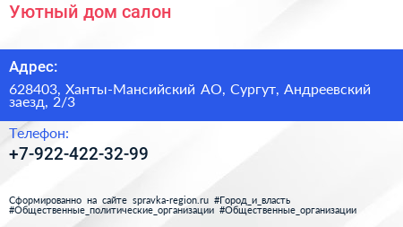 Уютный дом, салон по адресу 628403, Ханты-Мансийский АО, Сургут, Андреевский заезд, 2/3 в дальнейшем Организация, размещена в следующих категориях: