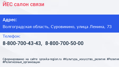 ЙЕС!, салон связи по адресу Волгоградская область, Суровикино, улица Ленина, 73 в дальнейшем Организация, размещена в следующих категориях: