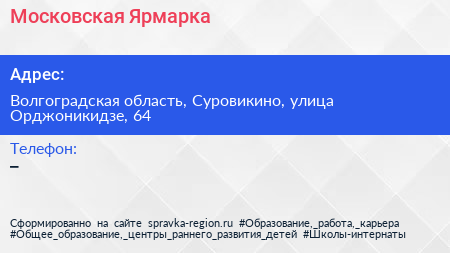Московская Ярмарка по адресу Волгоградская область, Суровикино, улица Орджоникидзе, 64 в дальнейшем Организация, размещена в следующих категориях: