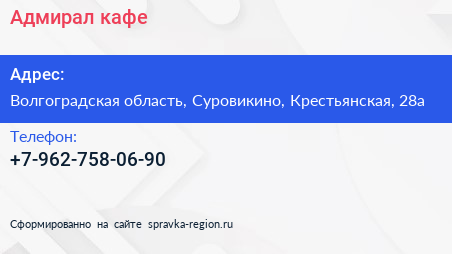 Адмирал, кафе по адресу Волгоградская область, Суровикино, Крестьянская, 28а в дальнейшем Организация, размещена в следующих категориях: