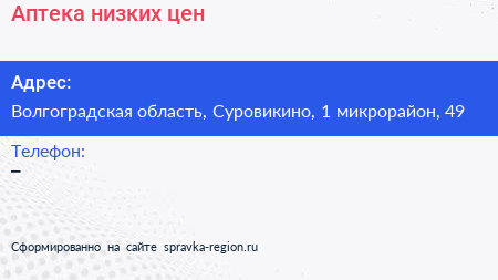 Аптека низких цен по адресу Волгоградская область, Суровикино, 1 микрорайон, 49 в дальнейшем Организация, размещена в следующих категориях: