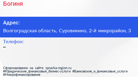Богиня по адресу Волгоградская область, Суровикино, 2-й микрорайон, 3 в дальнейшем Организация, размещена в следующих категориях: