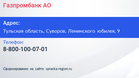 Газпромбанк, АО по адресу Тульская область, Суворов, Ленинского юбилея, 9 в дальнейшем Организация, размещена в следующих категориях: