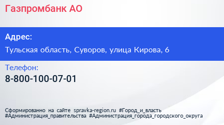 Газпромбанк, АО по адресу Тульская область, Суворов, улица Кирова, 6 в дальнейшем Организация, размещена в следующих категориях: