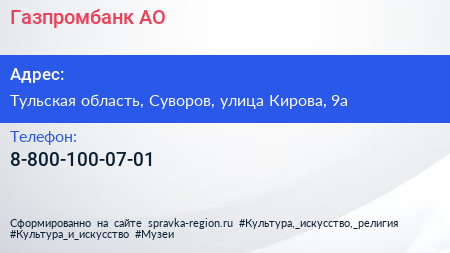 Газпромбанк, АО по адресу Тульская область, Суворов, улица Кирова, 9а в дальнейшем Организация, размещена в следующих категориях: