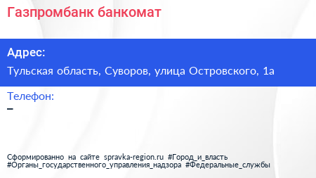 Газпромбанк, банкомат по адресу Тульская область, Суворов, улица Островского, 1а в дальнейшем Организация, размещена в следующих категориях: