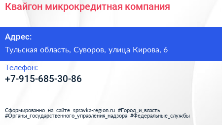 Квайгон, микрокредитная компания по адресу Тульская область, Суворов, улица Кирова, 6 в дальнейшем Организация, размещена в следующих категориях: