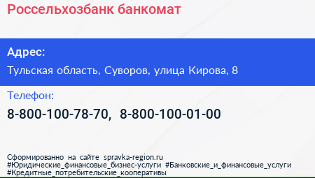 Россельхозбанк, банкомат по адресу Тульская область, Суворов, улица Кирова, 8 в дальнейшем Организация, размещена в следующих категориях: