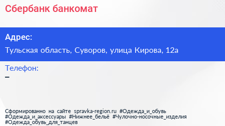 Сбербанк, банкомат по адресу Тульская область, Суворов, улица Кирова, 12а в дальнейшем Организация, размещена в следующих категориях: