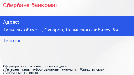 Сбербанк, банкомат по адресу Тульская область, Суворов, Ленинского юбилея, 9а в дальнейшем Организация, размещена в следующих категориях: