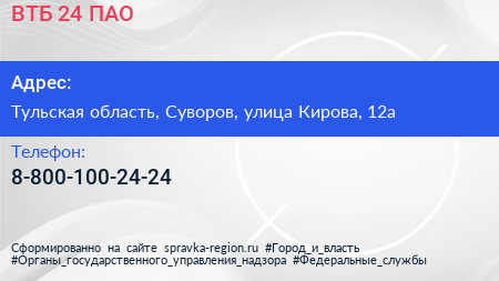 ВТБ 24, ПАО по адресу Тульская область, Суворов, улица Кирова, 12а в дальнейшем Организация, размещена в следующих категориях: