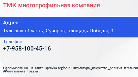ТМК, многопрофильная компания по адресу Тульская область, Суворов, площадь Победы, 3 в дальнейшем Организация, размещена в следующих категориях: