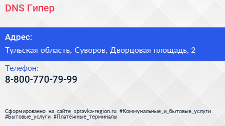 DNS Гипер по адресу Тульская область, Суворов, Дворцовая площадь, 2 в дальнейшем Организация, размещена в следующих категориях: