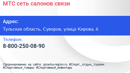 МТС, сеть салонов связи по адресу Тульская область, Суворов, улица Кирова, 6 в дальнейшем Организация, размещена в следующих категориях: