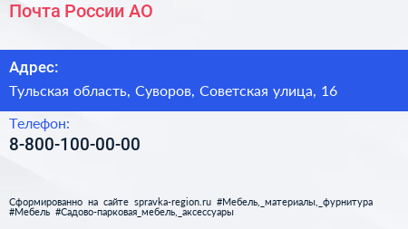 Почта России, АО по адресу Тульская область, Суворов, Советская улица, 16 в дальнейшем Организация, размещена в следующих категориях: