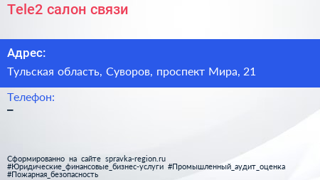 Tele2, салон связи по адресу Тульская область, Суворов, проспект Мира, 21 в дальнейшем Организация, размещена в следующих категориях: