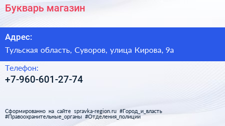 Букварь, магазин по адресу Тульская область, Суворов, улица Кирова, 9а в дальнейшем Организация, размещена в следующих категориях: