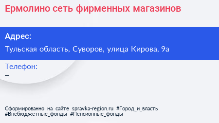 Ермолино, сеть фирменных магазинов по адресу Тульская область, Суворов, улица Кирова, 9а в дальнейшем Организация, размещена в следующих категориях: