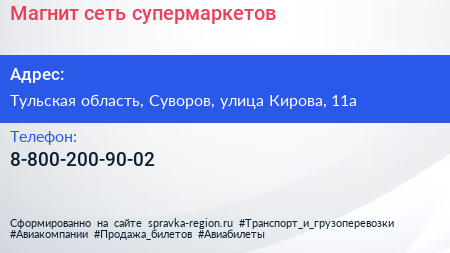 Магнит, сеть супермаркетов по адресу Тульская область, Суворов, улица Кирова, 11а в дальнейшем Организация, размещена в следующих категориях: