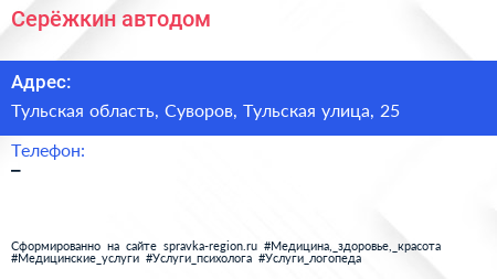Серёжкин, автодом по адресу Тульская область, Суворов, Тульская улица, 25 в дальнейшем Организация, размещена в следующих категориях: