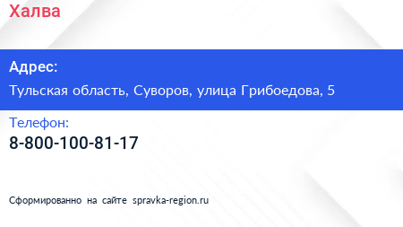 Халва по адресу Тульская область, Суворов, улица Грибоедова, 5 в дальнейшем Организация, размещена в следующих категориях: