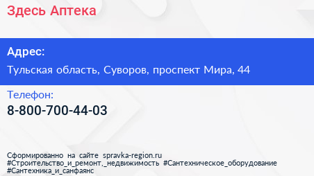 Здесь Аптека по адресу Тульская область, Суворов, проспект Мира, 44 в дальнейшем Организация, размещена в следующих категориях: