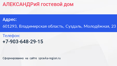 АЛЕКСАНДРиЯ, гостевой дом по адресу 601293, Владимирская область, Суздаль, Молодёжная, 23 в дальнейшем Организация, размещена в следующих категориях: