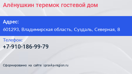 Алёнушкин теремок, гостевой дом по адресу 601293, Владимирская область, Суздаль, Северная, 8 в дальнейшем Организация, размещена в следующих категориях: