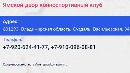 Ямской двор, конноспортивный клуб по адресу 601293, Владимирская область, Суздаль, Васильевская, 34 в дальнейшем Организация, размещена в следующих категориях: