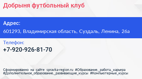 Добрыня, футбольный клуб по адресу 601293, Владимирская область, Суздаль, Ленина, 26а в дальнейшем Организация, размещена в следующих категориях: