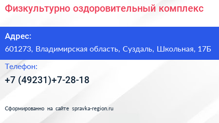 Физкультурно-оздоровительный комплекс по адресу 601273, Владимирская область, Суздаль, Школьная, 17Б в дальнейшем Организация, размещена в следующих категориях: