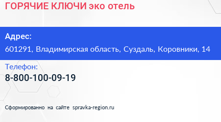 ГОРЯЧИЕ КЛЮЧИ, эко-отель по адресу 601291, Владимирская область, Суздаль, Коровники, 14 в дальнейшем Организация, размещена в следующих категориях: