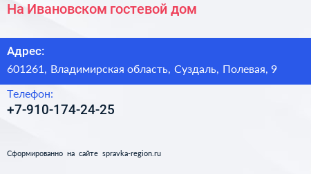 На Ивановском, гостевой дом по адресу 601261, Владимирская область, Суздаль, Полевая, 9 в дальнейшем Организация, размещена в следующих категориях: