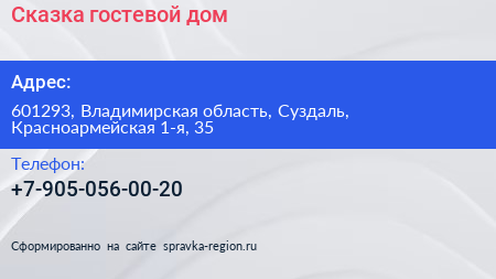 Сказка, гостевой дом по адресу 601293, Владимирская область, Суздаль, Красноармейская 1-я, 35 в дальнейшем Организация, размещена в следующих категориях: