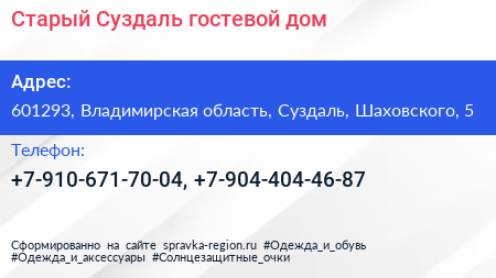 Старый Суздаль, гостевой дом по адресу 601293, Владимирская область, Суздаль, Шаховского, 5 в дальнейшем Организация, размещена в следующих категориях: